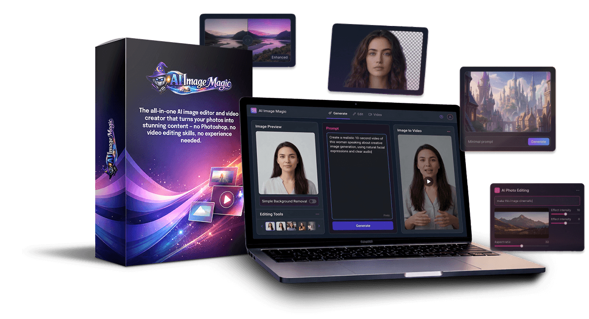 AI Image Magic is a cloud-based generative AI suite that consolidates three traditionally separate workflows: AI image generation, semantic image editing, and image-to-video animation. Launched by Brett Rutecky and Mike From Maine, it’s designed specifically for the “non-designer” who needs high-impact marketing assets.