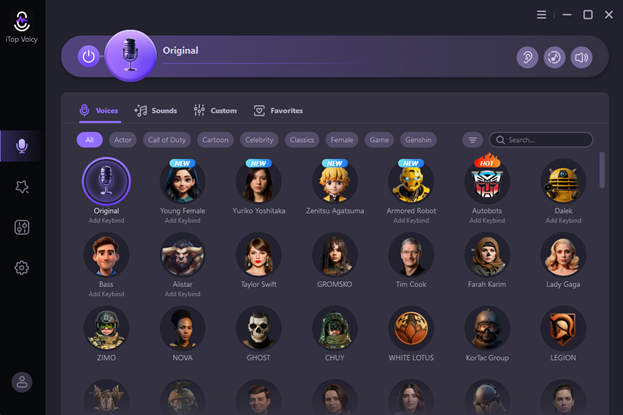 ITop Voicy features an impressive real-time voice-changing engine. You just select a voice from an extensive collection of voice types—male, female, robotic, cartoonish, epic, horror, and many others.