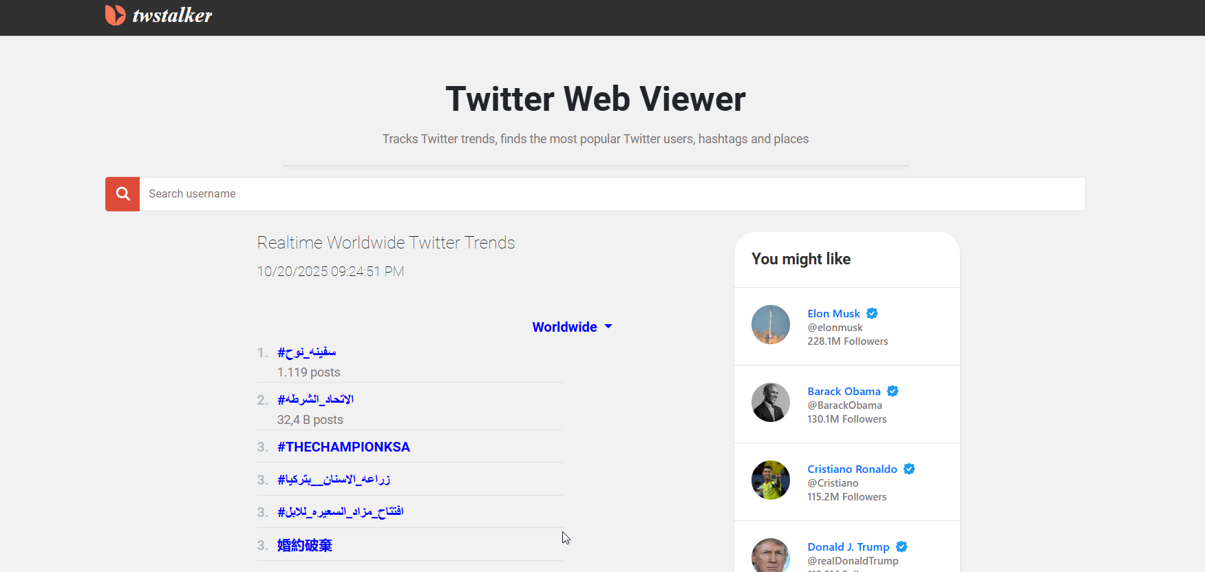 Twstalker allows you to view X profiles anonymously, including followers, media, and tweet history. It also shows engagement metrics and related profiles.